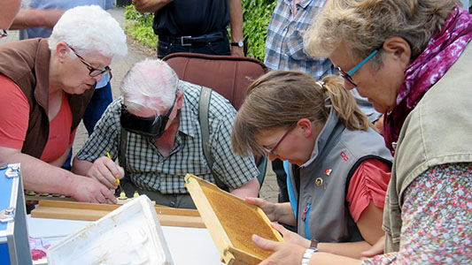 mit der Pinzette wird die Amerikanische Faulbrut diagnostiziert, Verhaltensmaßnahmen für den Sachverständigen wurden geübt, die Klopfprobe wurde praktisch durchgeführt.